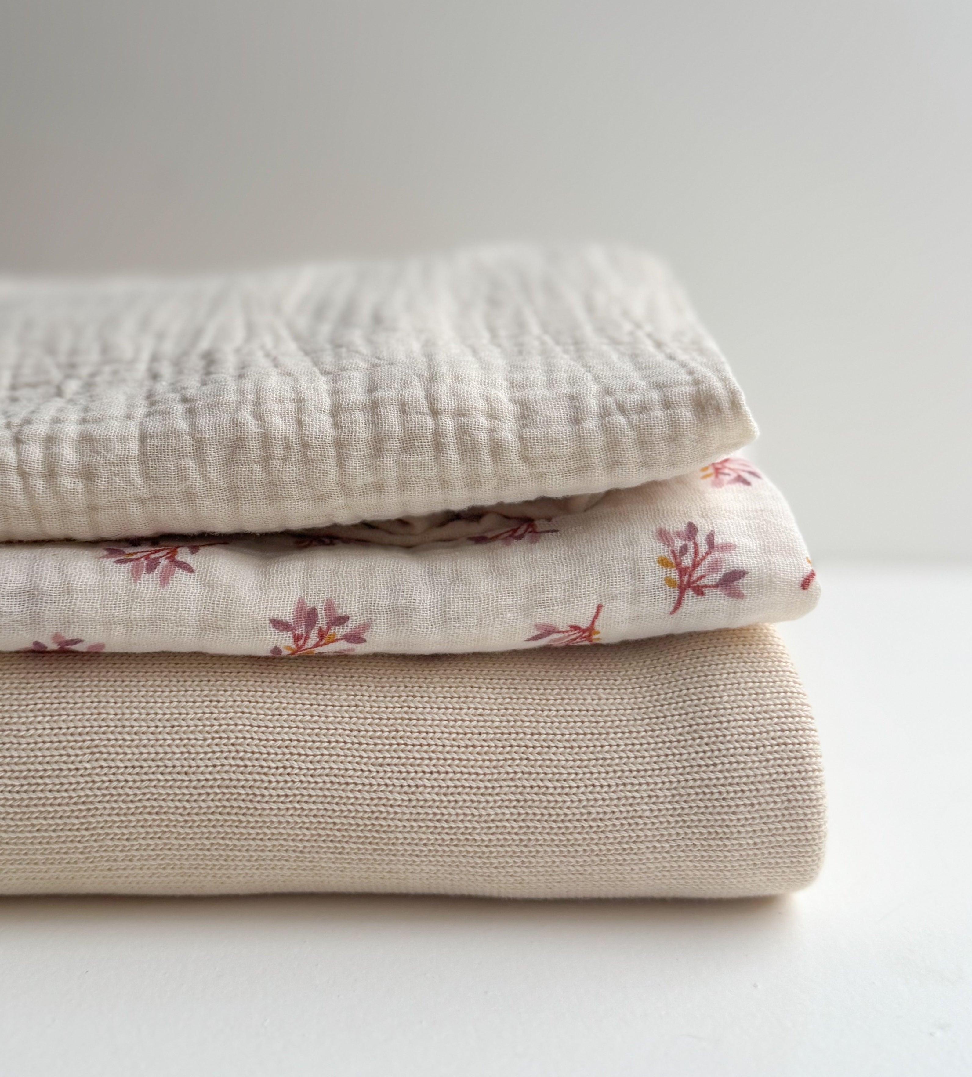 KenmerkenHoeslaken hydrofiel naturel: 80X40 CMLakentje hydrofiel bloesemtakjes lente: 100X70 CMWiegdekentje gebreid naturel: 100X70 CM